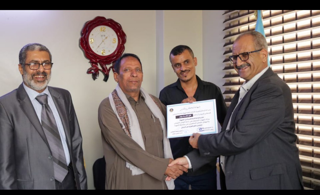 ومنحت الشهادات التقديرية لرؤوساء الادارات الجماهيرية لانتقالي ابين ممثلة برئيسها “عمر محمد ناصر الهارش والادارة الجماهيرية للمهرة ممثلة برئيسها ” ناصر كرس ” من قبل الدائرة الجماهيرية للامانة العامة للمجلس الانتقالي التي يرأسها الدكتور ( محمد فضل القطيبي ) ذلك نتاج لنشاط تلك الإدارات في العمل الجماهيري والنهوض به في محافظاتهم .