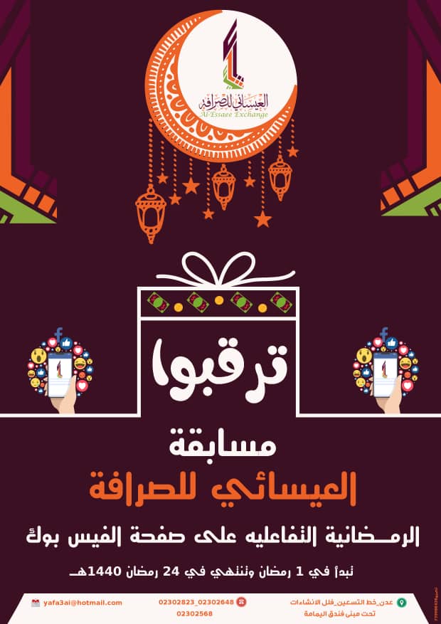 أعلنت شركة العيسائي للصرافة في العاصمة عدن المنصورة خط التسعين بجانب فلل الإنشاءات عن المسابقة التفاعلية عبر موقعه على التواصل الاجتماعي في الفيس بوك وتتكون المسابقة من سؤال سيعلن علية في أول أيام شهر رمضان المبارك و يتضمن السؤال الإجابة عنه وعدة شروط تفاعلية يتم تنفيذها بحيث تمكن المشاركين من دخول السحب النهائي والذي سوف يعلن عن الفائزين الأربعة بالجوائز المالية بتاريخ 24 من شهر رمضان المبارك 1440ه