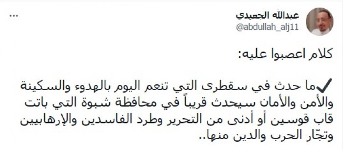 وقال في تغريدة على حسابه بتويتر، اليوم السبت: “كلام اعصبوا عليه: ما حدث في سقطرى التي تنعم اليوم بالهدوء والسكينة والأمن والأمان سيحدث قريباً في محافظة شبوة”.