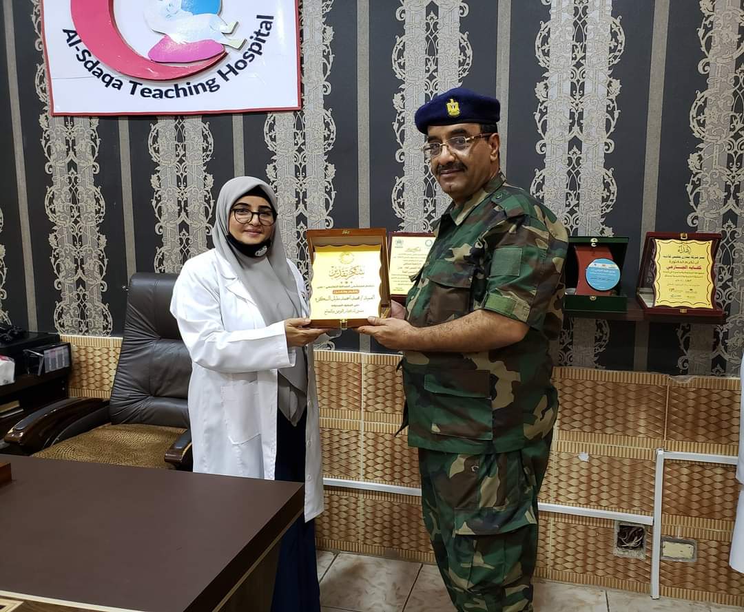 كرمت قيادة مستشفى الصداقة التعليمي العام في عدن ممثلة بالدكتورة كفاية الجازعي مدير المستشفى اليوم العميد محمد احمد سكرة قائد المنطقة السادسة.