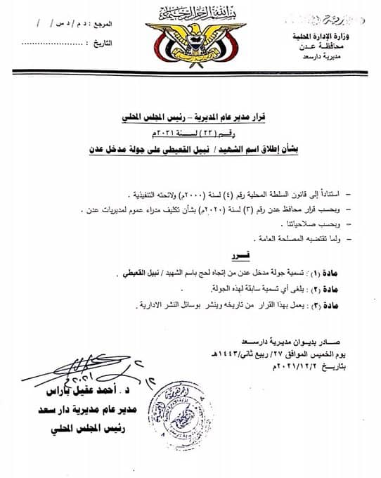 اصدر الدكتور احمد عقيل باراس مدير عام مديرية دارسعد بالعاصمه عدن اليوم الخميس القرار رقم (22) لعام 2021م ،