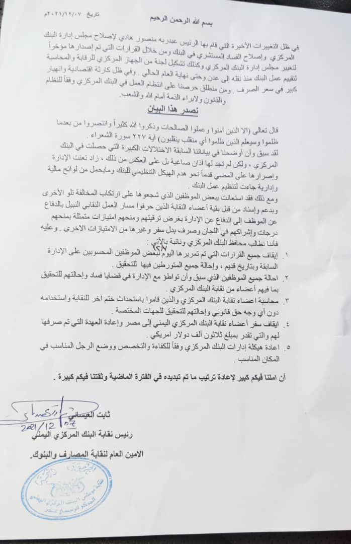 حيث طالبت نقابة البنك المركزي اليمني محافظ البنك المركزي ونائبة بإيقاف جميع القرارات التي تم تمريرها اليوم لبعض الموظفين المحسوبين على الإدارة السابقة وبتاريخ قديم ، وإحالة جميع المتورطين فيها للتحقيق