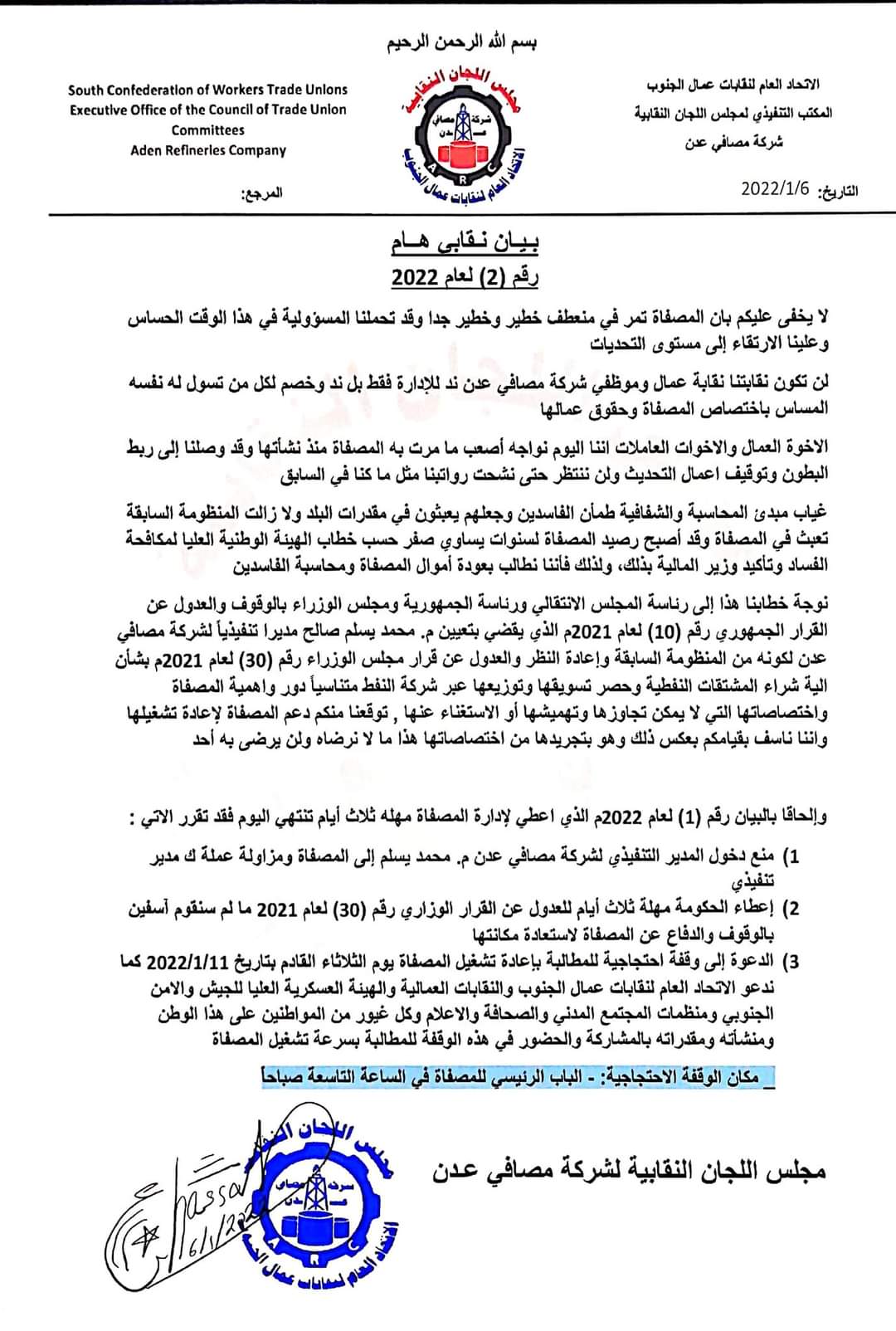 3) الدعوة إلى وقفة احتجاجية للمطالبة بإعادة تشغيل المصفاة يوم الثلاثاء القادم بتاريخ 11/1/2022 كما ندعو الاتحاد العام لنقابات عمال الجنوب والنقابات العمالية والهيئة العسكرية العليا للجيش والامن الجنوبي ومنظمات المجتمع المدني والصحافة والاعلام وكل غيور من المواطنين على هذا الوطن ومنشأته ومقدراته بالمشاركة والحضور في هذه الوقفة للمطالبة بسرعة تشغيل المصفاة