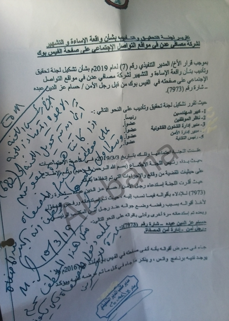 وعقدت اللجنة المشكلة للتحقيق على خلفية التشهير والاساءة في صفحات التواصل الاجتماعي بحسب زعمهم مع الموظف حسام جلستين ،ففي الاولى قالت اللجنة انها تعثرت للتحقيق معه لسبب ان الموظف لم يسلم جواله ، بينما في الجلسة الثانية نفى حسام ان يكون لديه حساب في الفيس بوك منذ عام ص2016م واكد حسام انه يمارس تواصله على الوتس اب .