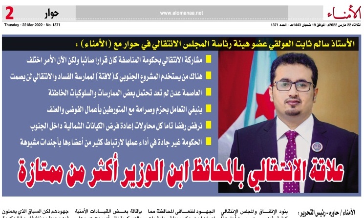 سالم ثابت العولقي عضو هيئة رئاسة الانتقالي في حوار مع “الأمناء” : هناك من يستخدم المشروع الجنوبي كـ”لافتة” لممارسة الفساد والانتقالي لن يصمت