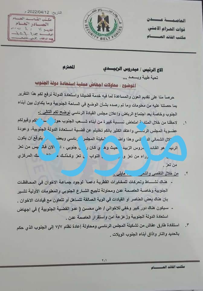 كشف العميد محسن الوالي قائد قوات الحزام الأمني زيف الوثيقة المسربة باسمه والتي جرى تداولها في مواقع منصات التواصل الاجتماعي .