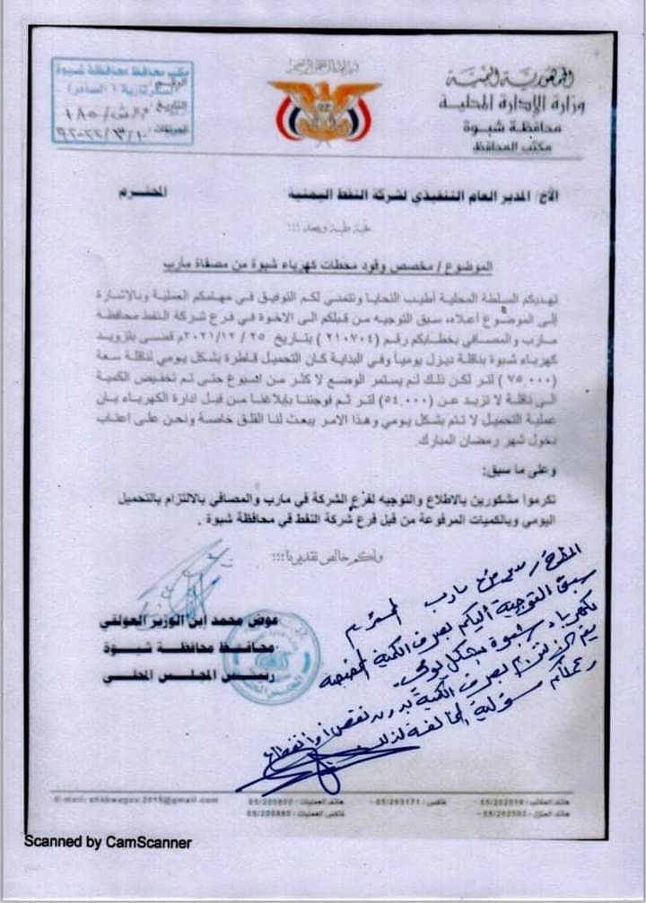 وبحسب الوثيقة فقد وجه مدير شركة النفط بصرف مخصص كهرباء شبوة من الديزل، غير أن شركة النفط فرع مأرب رفضت صرف حصة شبوة المخصصة للكهرباء من مصفاة صافر.