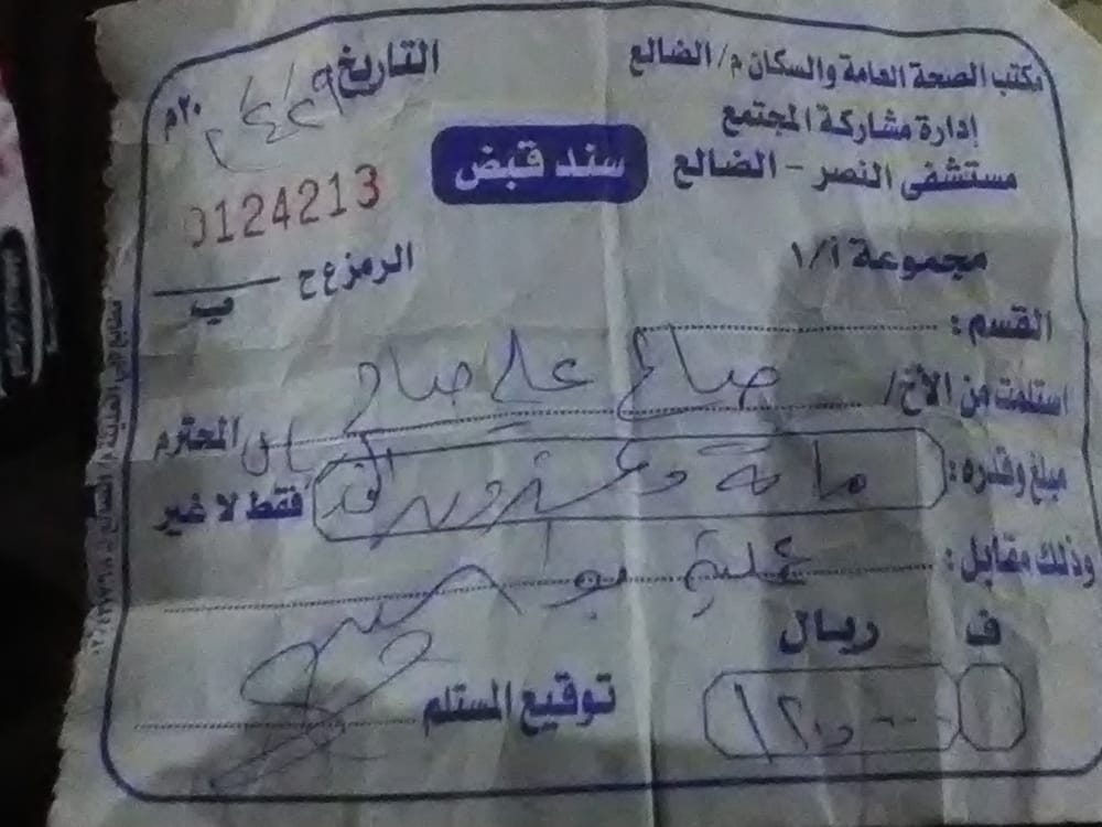حدث هذا في مستشفى( النصر) – الضالع– مواطن ضالعي يصرخ – تم تجهيز والدي للعملية فاوقفها دكتورا طالبا مبلغ نقدي مضاعف