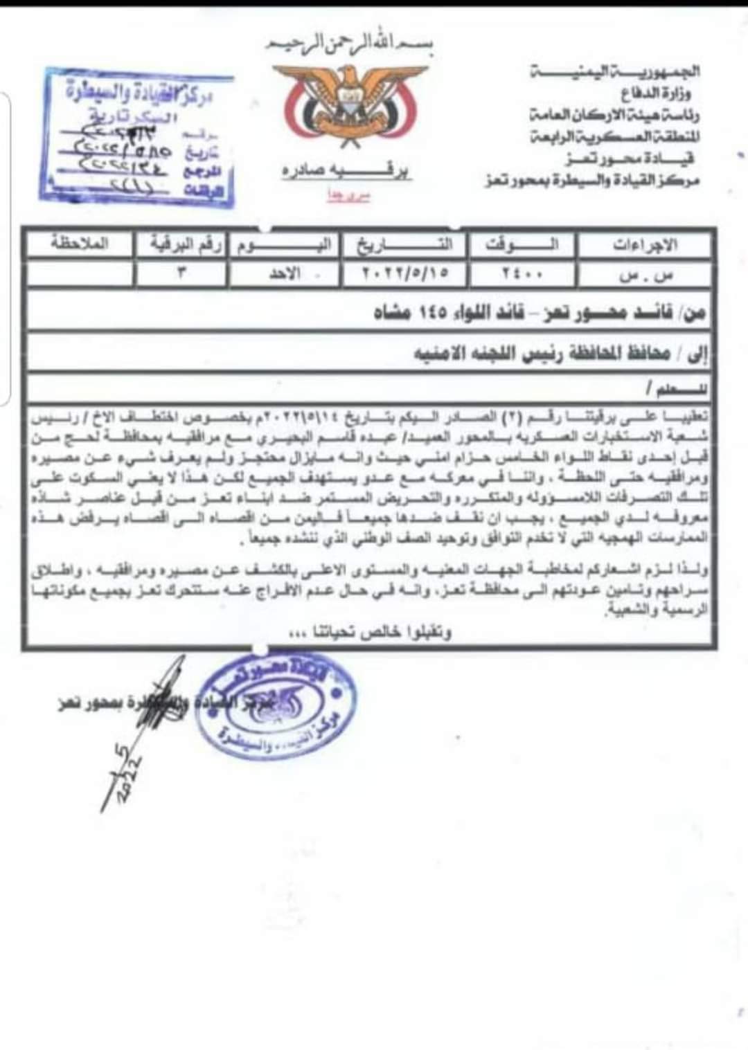 وحصلت النقابي الجنوبي على مذكرة وجهها قائد محور تعز إلى محافظ المحافظة يطالبه فيها تدخله المباشر للإفراج الفوري على رئيس شعبة الاستخبارات في محور تعز الذي وقع في قبضة رجال الأمن الجنوبي بحسب إفادته للمحافظ ، إذ أن السلطات الأمنية في العاصمة الجنوبية عدن لم تعلن رسميا عن إلقاء القبض على الإرهابي البحيري حتى اللحظة .