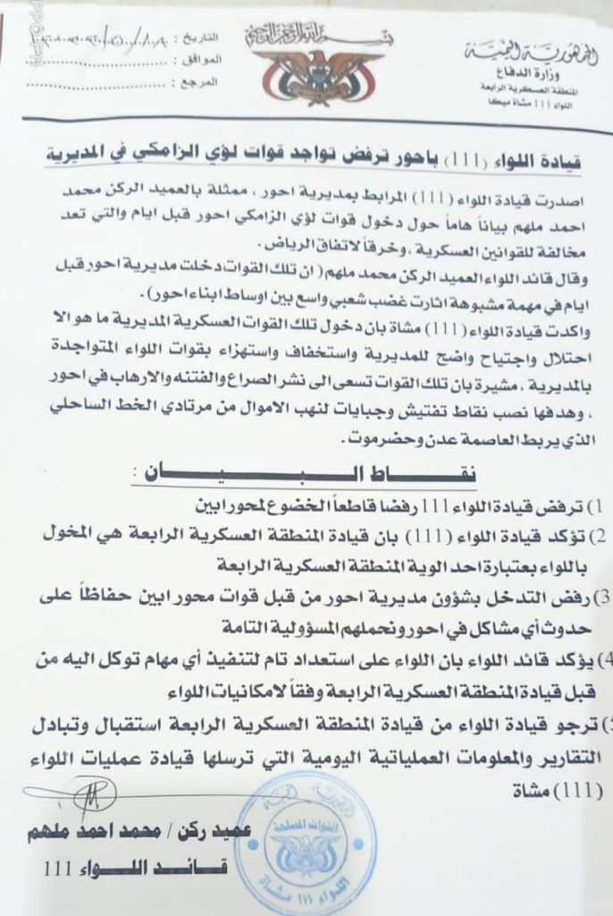 أصدرت قيادة اللواء «111» المرابط بمديرية أحور، ممثلة بالعميد الركن محمد أحمد ملهم بيانا هاما حول دخول قوات لؤي الزامكي أحور قبل أيام والتي تُعد مخالفة للقوانين العسكرية، وخرقا لاتفاق الرياض.
