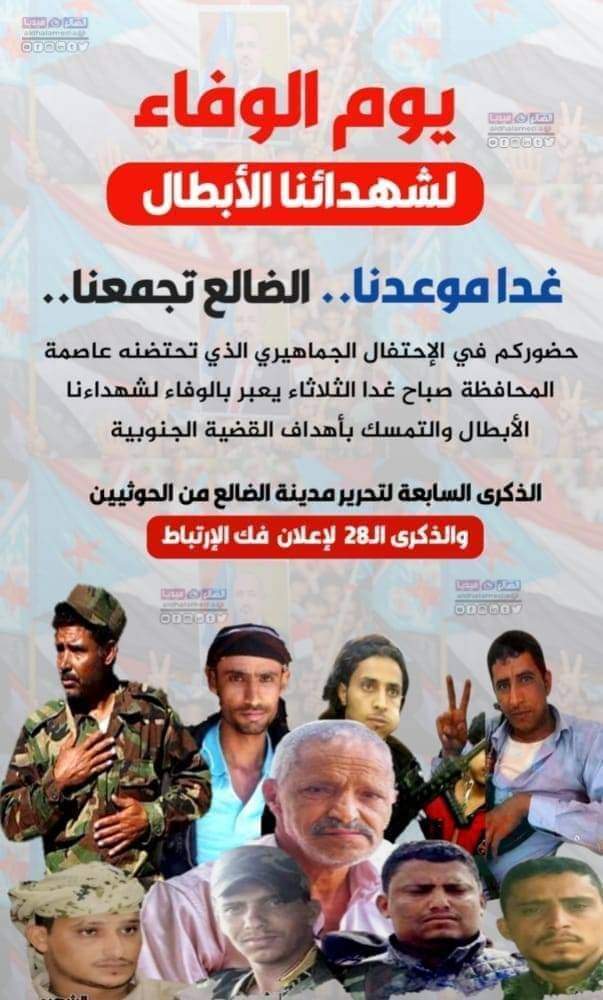 دعت القيادة المحلية للمجلس الانتقالي بمحافظة الضالع كل أبناء المحافظة للمشاركة الفاعلة في الفعالية الاحتفائية التي ستقام بعاصمة المحافظة صباح اليوم الثلاثاء الموافق ٢٤/مايو ٢٠٢٢م بمناسبتي أحياء الذكرى الــ ٢٨ لإعلان فك الارتباط بين الجمهورية العربيه اليمنيه والجنوب العربي وكذلك للإحتفاء بالذكرى الــ ٧ لتحرير محافظة الضالع من مليشيات وقوات الإحتلال الحوثية العفاشية .
