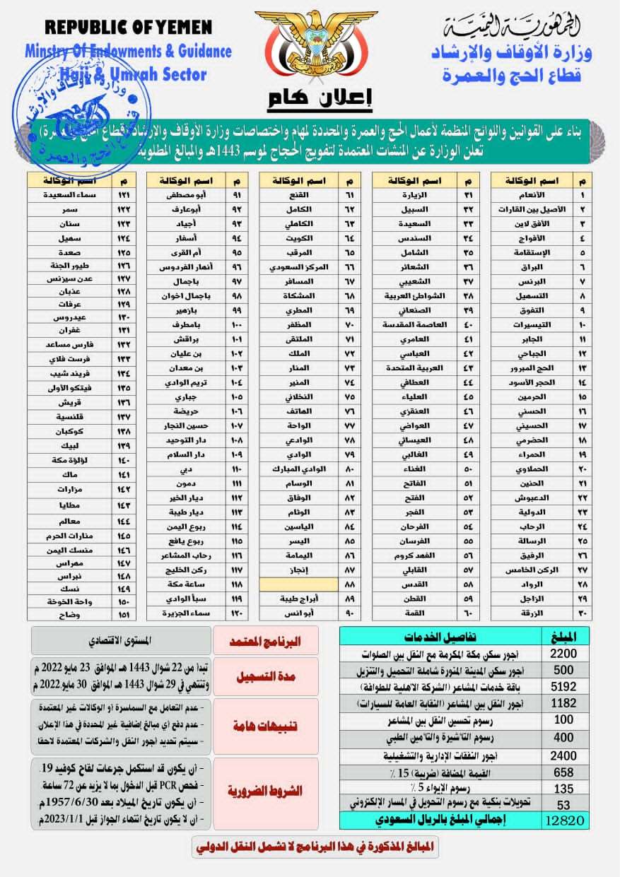 كما حذرت الوزارة، عموم المواطنين، من دفع أي مبالغ إضافية عن المبلغ المحدد في الإعلان أو التعامل مع السماسرة أو الوكالات الوهمية وغير المعتمدة، التي لم يشملها إعلان الحج الصادر عن قطاع الحج والعمرة وإبلاغها عن أي مخالفة أو تجاوز عبر ديوانها العام بالعاصمة المؤقتة عدن، أو قطاع الحج والعمرة، أو عبر الإيميل وصفحاتها الرسمية في مواقع التواصل الاجتماعي.