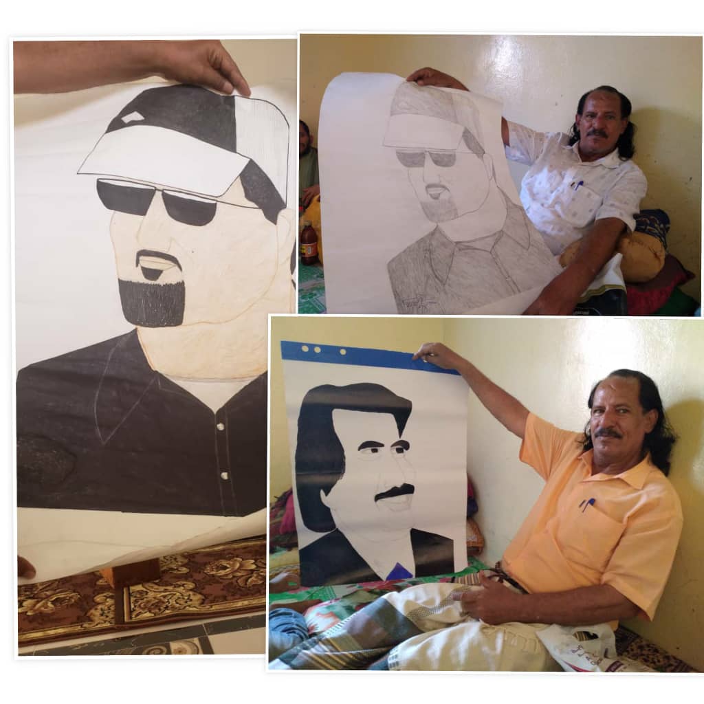 لافتا بقوله: لنا في المعرفة تاريخ لكنها حالت الصعوبات والمعوقات وبذلك لم استطع الوصول اليه لاجد نفسي منهمكا في رسم شخصيته من خلال عقلي لاحاجة لنا الرجوع لصوره او ماشابه ذلك والسبب اننا استلهم رسم صورته من عقلنا وصميم قلبناكون حبه متوغلا فيه اخذا مساحة حب وبذلك رسمت له عدة رسومات بما يناسب شخصيته العظيمة.
