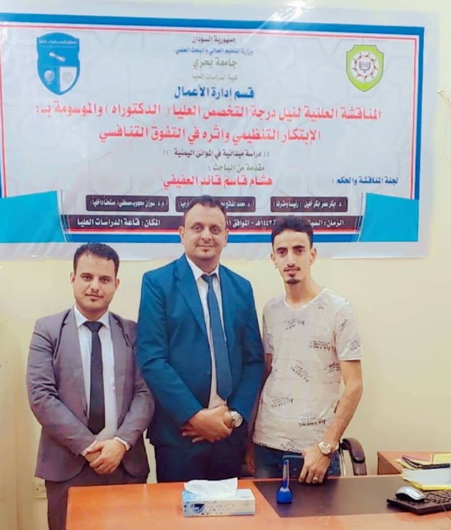 نال الباحث هشام قاسم قائد العفيفي امس السبت الموافق “م١١/٦/٢٠٢٢ “درجة الدكتوراه بامتياز، من جامعة بحري كلية الدراسات العليا قسم إدارة الأعمال بجمهورية السودان الشقيقة.