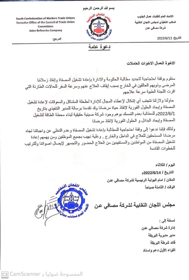 دعوته للعمال لوقفة احتجاجية لتجديد مطالبة الحكومة والادارة بإعادة تشغيل المصفاة وإنقاذ زملاءهم المرضى وذويهم العالقين في الخارج بسبب ايقاف العلاج عنهم.