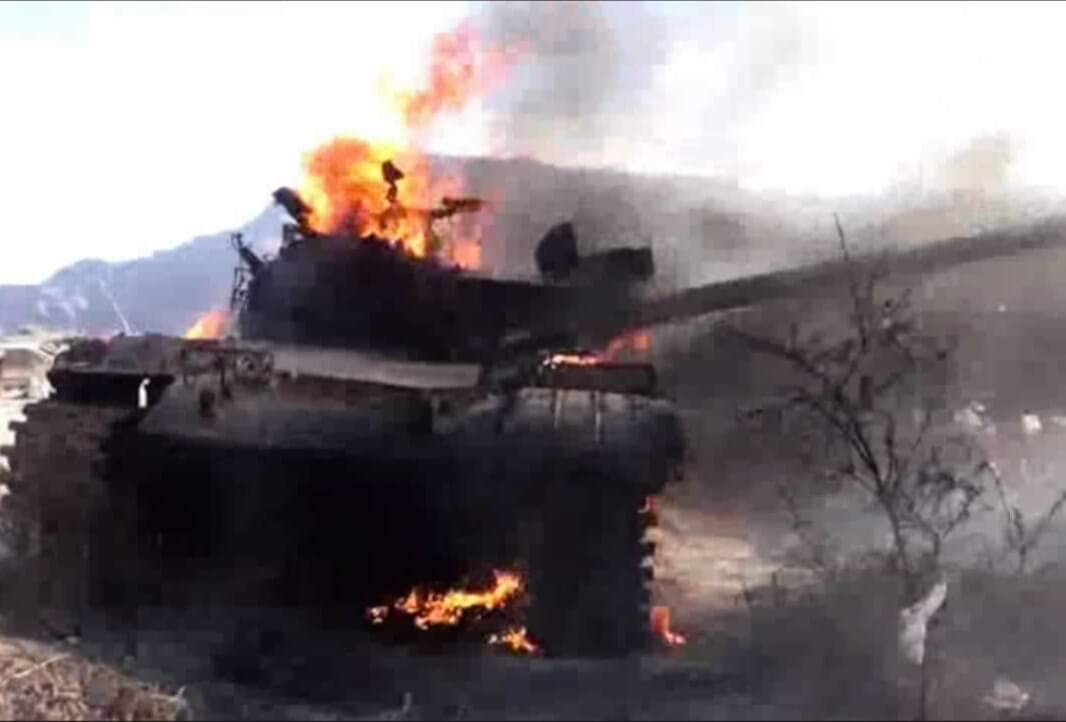 وفي وقت الإفطار دمر صاروخ كورنيت حراري دبابة للمليشيات الحوثية بمنطقة سليم.