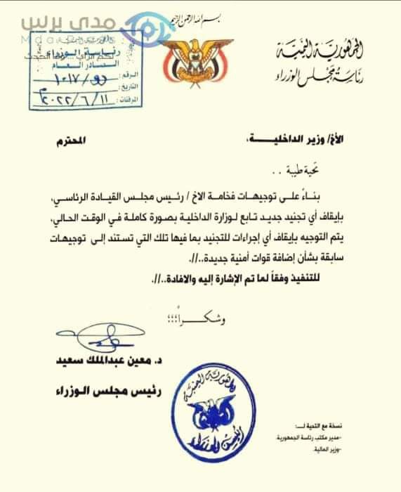 كشفت مصادر خاصة ومقربة من الإخواني( ابراهيم حيدان) تجاوزه قرار مجلس القيادة الرئاسي والمعزز من قبل رئيس الحكومة والقاضي توقيف اي تجنيد تابع لوزارة الداخلية بصورة كاملة في الوقت الحالي.