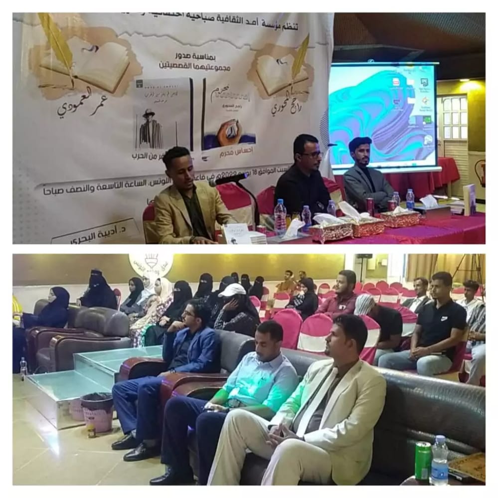 برعاية معالي وزير الدولة محافظ العاصمة عدن الأستاذ أحمد حامد لملس.. نظمت مؤسسة أمد الثقافية أمس السبت، صباحية احتفائية وتكريمية للقاصين الأستاذ عمر محمد العمودي والاستاذ راجح المحوري، بقاعة منتج اللوتس بخورمكسر بالعاصمةعدن، بمناسبة صدور مجموعتيهما القصصيتين «إحساس مُحرّم» للقاص راجح المحوري و«لاجى لم يفر من الحرب» للقاص عمر العمودي.
