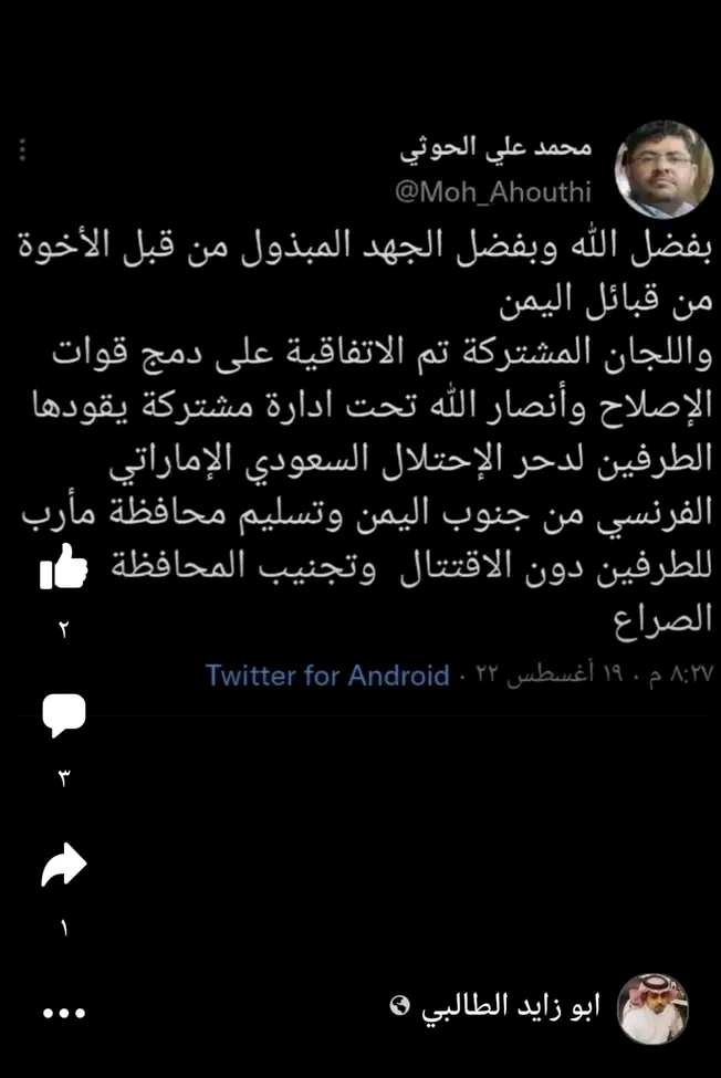 وقال الرافضي القيادي محمد الحوثي في تغريدة له على صفحته (تويتر) بان الاتفاق المبرم بين الطرفين جاء لدحر التحالف العربي والفرنسي من الجنوب.