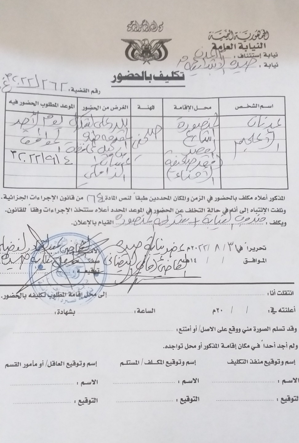 وفوجئ طاقم صحيفة “الأمناء” مساء اليوم بحضور شخصان أحدهما مسلح إلى مقر الصحيفة لتسليم أمر تكليف بالحضور لرئيس التحرير أمام النيابة العامة للرد حول ما زعم أمر الحضور بانها شكوى تقدم بها وكيل محافظة عدن غسان الزامكي .