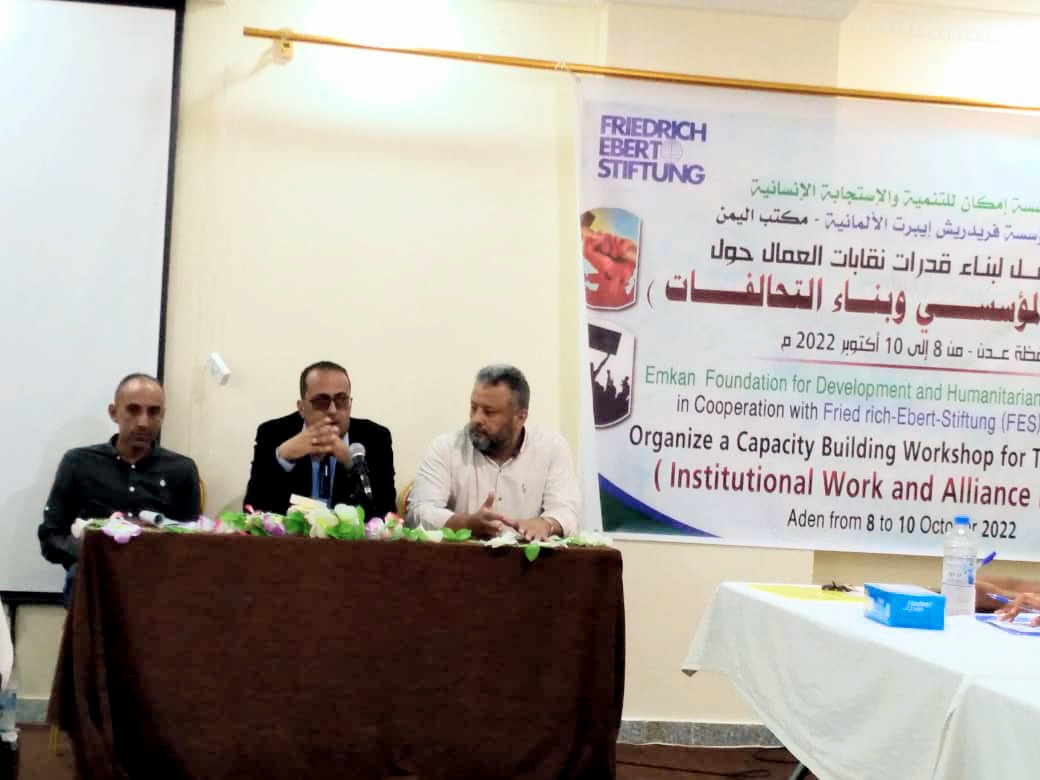 بناء قدرات النقابات العمالية للعاصمة عدن في متناول مؤسسة فريدريش ايبرت ومؤسسة إمكان للتنمية والاستجابة الإنسانية.