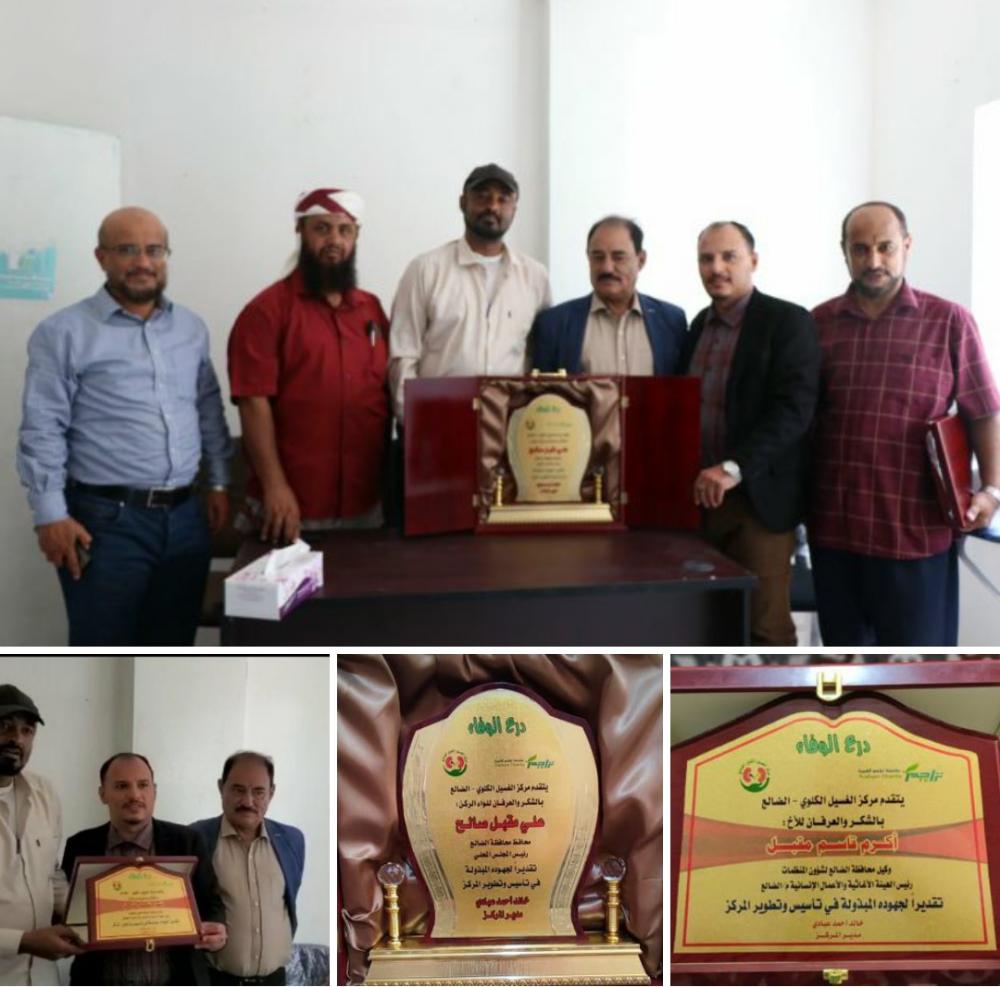وفي نفس السياق تم تكريم الأستاذ اكرم قاسم مقبل وكيل محافظة الضالع لشؤون المنظمات رئيس هيئة الإغاثة الإنسانية بدرع الوفاء على دورة البارز في تأسيس المركز ووقوفه إلى جانب إيصال الدعم إلى مركز الغسيل الكلوي