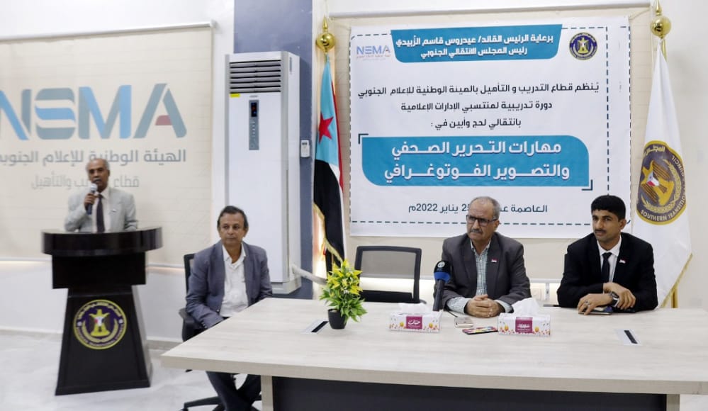 برعاية الرئيس القائد عيدروس قاسم الزبيدي وبحضور الامين العام للأمانة العامة للمجلس الانتقالي الجنوبي الاستاذ / فضل الجعدي افتتحت الهيئة الوطنية للأعلام الجنوبي صباح اليوم بمركز قطاع التدريب والتأهيل في العاصمة عدن دورة تدريبية في مجال التحرير الصحفي والتصوير الفوتوغرافي لمنتسبي الادارات الأعلامية بأنتقالي محافظتي ابين و لحج بمشاركة 20 اعلامي واعلامية من المحافظتين..