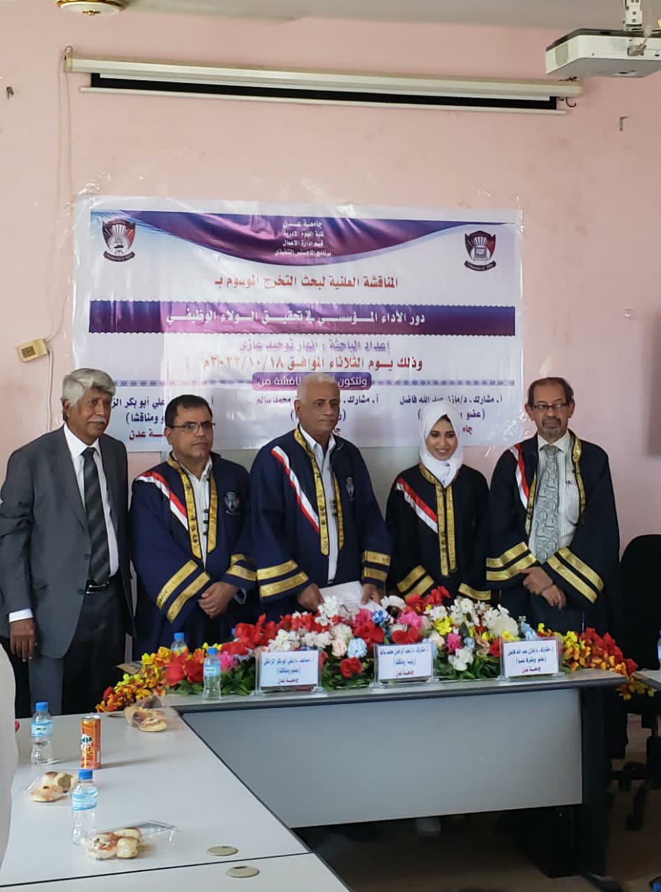 نالت الباحثة انهار توحيد غازي صباح اليوم درجة الماجستير التنفيذي من قسم ادارة الاعمال كلية العلوم الادارية جامعة عدن عن رسالتها الموسومة ب”اثر الاداء المؤسسي في تحقيق الولاء الوظيفي .