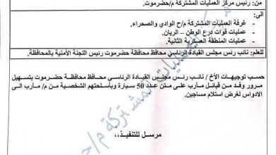 تطور خطير يهدد أمن حضرموت واليمن عمومًا جلال باشافعي ما يتم تداوله اليوم من وثيقة رسمية صادرة عن مركز العمليات المشتركة بمحافظة حضرموت يمثل أمرًا بالغ الخطورة ولا يمكن التعامل معه بصمت أو تبرير. الوثيقة تؤكد أن التوجيه صدر بموافقة…