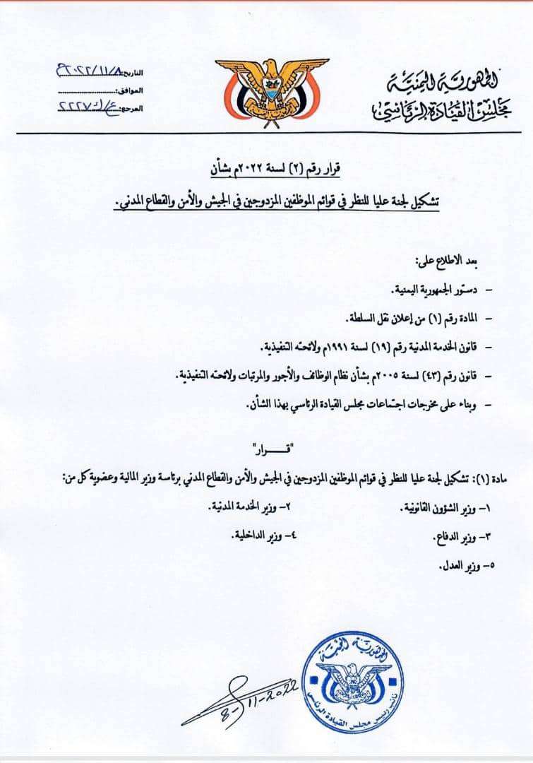وقضى القرار بتشكيل لجنة عليا للنظر في قوائم الموظفين المزدوجين في الجيش والأمن والقطاع المدني برئاسة وزير المالية وعضوية كلٍ من :- وزير الشؤون القانونية ، ووزير المالية ، ووزير الدفاع ، وويزر الداخلية ، ووزير العدل