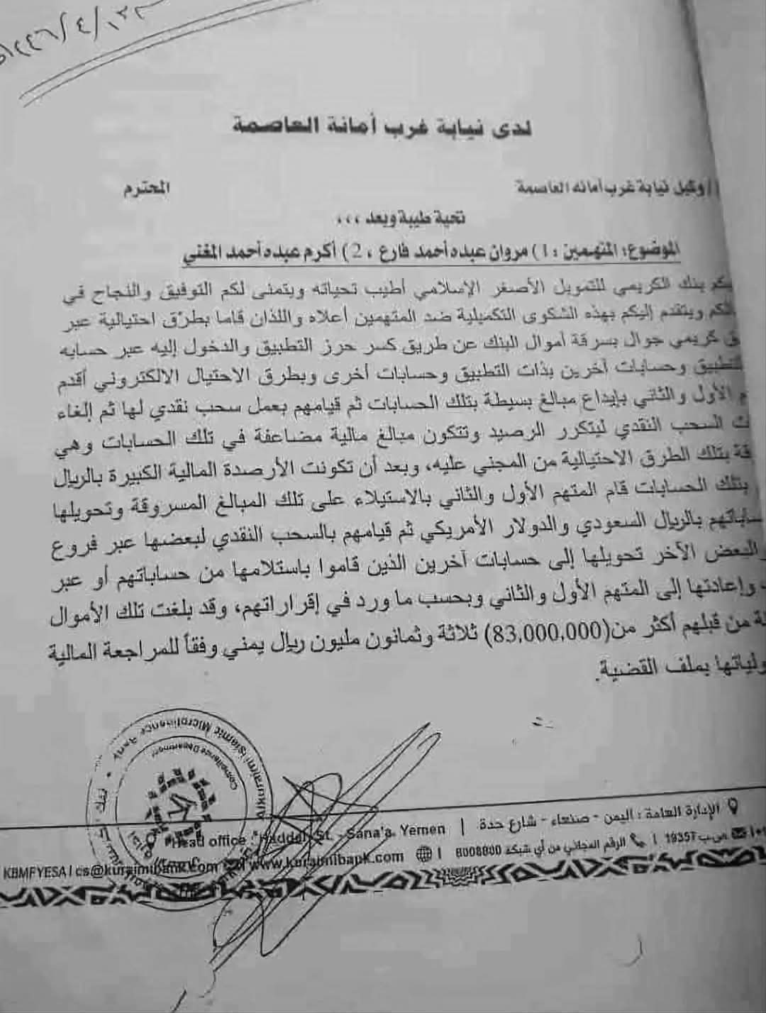 كشفت وثيقة صادرة عن بنك الكريمي للتمويل الأصغر المقر الرئيسي صنعاء اليمنية موجهة إلى وكيل نيابة غرب أمانة العاصمة اليمنية أن شخصان من محافظة تعز اليمنية اتهما بالإقدام على تنفيذ عملية احتيال عبر تطبيق كريمي جوال عبر تزوير حسابات في بنك الكريمي وسرقة أموال البنك عن طريق كسر حرز التطبيق والدخول إليه من خلال حسابه في التطبيق وحسابات أخرى بذات التطبيق إضافة إلى حسابات أخرى وبطرق الاحتيال الالكتروني.