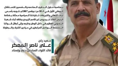 العميد المعكر يهنئ القيادة السياسية والعسكرية وشعب الجنوب بحلول الذكرى الـ56 لعيد الاستقلال الجنوبي.