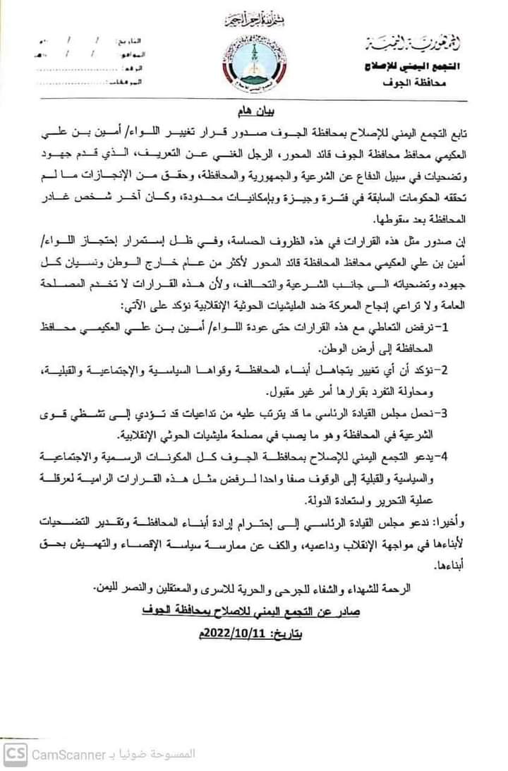 وأوضح بيان صادر عن حزب الإصلاح فرع ‎الجوف رفضهم لقرار المجلس الرئاسي بإقالة اللواء/امين العكيمي من منصب محافظ محافظة الجوف.