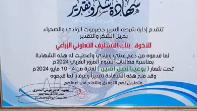 ادارة شرطة السير بحضرموت الوادي والصحراء تكرم «كاك بنك» بشهادة شكر وتقدير
