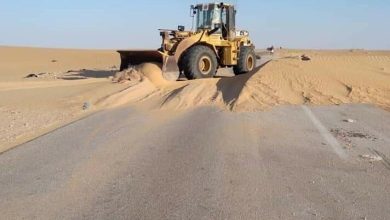 مؤسسة الطرق شبوة تباشر إزاحة الرمال المتحركة من الطريق الدولي عتق العبر