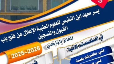 فتح باب القبول والتسجيل في معهد ابن النفيس للعلوم الصحية بأبين للعام الجامعي 2025-2026م