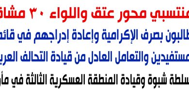 ردا على منطقة مأرب العسكرية.. محور عتق واللواء 30 مشاة: يكفى تهميشًا.. ولن نسمح بتجاهل حقوقنا