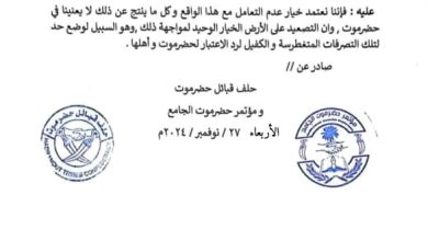 حلف قبائل حضرموت ومؤتمر حضرموت الجامع يعلنان تمردهما على مجلس القيادة الرئاسي (بيان)
