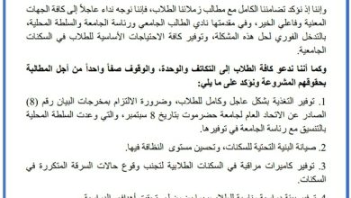 بيان ناري من طلاب الهندسة بجامعة حضرموت: السكنات الجامعية بلا تغذية ولا أمان!