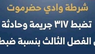 شرطة وادي حضرموت تضبط 317 جريمة وحادثة خلال الفصل الثالث بنسبة ضبط 89 %