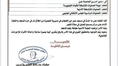 توجيهات عاجلة من محافظ العاصمة عدن بشأن حادثة مسجد عمر بن الخطاب في المنصورة
