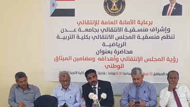 النقابي الجنوبي / عدن / رياض مطر برعاية الأمانة العامة للمجلس الانتقالي واشراف منسقية الانتقالي بجامعة عدن، نظمت منسقية المجلس الانتقالي بكلية التربية الرياضية محاضرة سياسية حملت عنوان “رؤية المجلس الانتقالي واهدافه ومضامين ميثاقه الوطني” القاها المناضل المقاوم والصحفي…