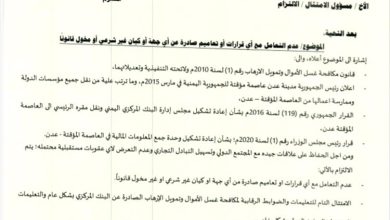عدن تشدد الخناق على المؤسسات المالية الغير شرعية وتُحذّر: اللاعبون خارج القانون سيُحاسبون بلا رحمة (وثيقة)