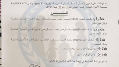 رئيس مصلحة الأحوال المدنية بعدن يصدر عددا من قرارات