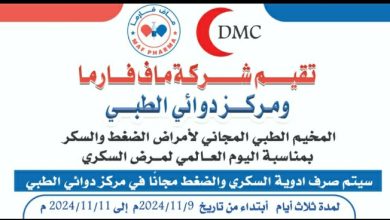 في إطار الاحتفال باليوم العالمي لمرض السكري، تُقيم شركة “ماف فارما” بالتعاون مع مركز “دوائي الطبي” مخيمًا طبيًا مجانيًا لأمراض الضغط والسكري. وسيتم صرف أدوية السكري والضغط مجانًا في المركز الطبي على مدى ثلاثة أيام، بدءًا من 9 نوفمبر حتى…