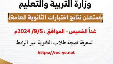 عدن / الإعلام التربوي أعلنت وزارة التربية والتعليم بالعاصمة عدن أن يوم غد الخميس سيكون إعلان نتيجة اختبارات الثانوية العامة للعام الدراسي 2023 / 2024م وأوضحت الوزارة أن إعلان النتيجة سيتم عبر موقع نتائج الثانوية العامة (https://res-ye.net).. وأشارت في…