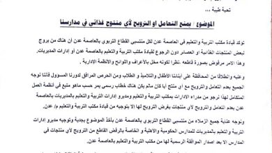 ادارة التربية والتعليم عدن تصدر تعميمايمنع التعامل أو الترويج لأي منتوج غذائي في المدارس