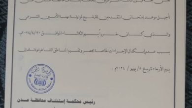 النقابي الجنوبي /عدن /إعلام وزارة العدل أعلنت لجنة قبول الأمناء الشرعيين بمحكمة استئناف محافظة عدن, تأجيل موعد امتحان القبول للاخوة المتقدمين للحصول على تراخيص مزاولة مهنة أمين شرعي. وأكدت المحكمة أن موعد الامتحان بتاريخ 5 /…