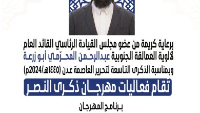 النقابي الجنوبي /خاص برعاية كريمة من نائب رئيس المجلس الانتقالي الجنوبي، عضو مجلس القيادة الرئاسي القائد العام لألوية العمالقة الجنوبية عبدالرحمن المحرّمي “أبو زرعة” وبمناسبة الذكرى التاسعة لتحرير العاصمة عدن (١٤٤٥هـ/2024م) تُقام فعاليات مهرجان ذكرى النصر وتقام الفعالية يوم…