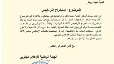 الهيئة الوطنية للإعلام الجنوبي تُصدر تعميمًا بشأن تراخيص المؤتمرات والورش والفعاليات بالعاصمة عدن (وثيقة)
